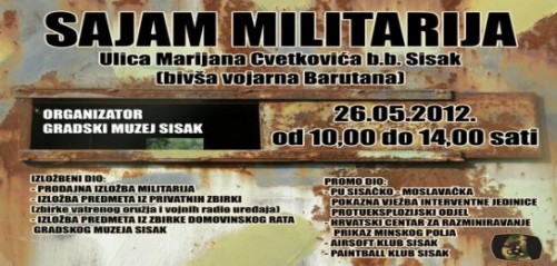 Gradski muzej Sisak na prostoru budućeg muzejskog postava Domovinskog rata „Barutana“, (Ulica Marijana Cvetkovića bb), u subotu, 26. svibnja 2012. godine organizira Drugi sisački sajam militarija. Sajam će se održati od 10 do 14 sati, a obuhvaća brojne izložbene i edukativne sadržaje. U izložbeno-edukativnom dijelu sajma predstavit će se dva kolekcionara s dijelom svojih zbirki vatrenog oružja i vojnih radio uređaja. Na Sajmu će sudjelovati i PU sisačko-moslavačka koja će na izložbenim štandovima i pokaznim vježbama predstaviti svoj rad. Posebno zanimljivo bit će u 13 sati kada će Interventna jedinica održati prikaz borilačkih vještina i uporabe vatrenog oružja uz korištenje simulacijskog streljiva i balističkog štita. Uz predstavljanje specijalističke opreme i oružja Interventne jedinice, svoju opremu predstavit će i Odjel protueksplozijske zaštite. Djelatnici Hrvatskog centra za razminiravanje prikazat će izgled minskog polja s najopasnijim minama koje su zaostale iz vremena Domovinskog rata i upozoriti na još uvijek postojeću opasnost od mina. I ove će godine na Sajmu sudjelovati Airsoft klub Sisak i Paintball klub Sisak koji će posjetiteljima također predstaviti svoj rad. U prodajnom dijelu sudjelovat će kolekcionari militarija s prodajnim štandovima na kojima će se moći razgledati i kupiti predmeti i literatura vojne tematike. U 12 sati će organizator posjetitelje sajma počastiti vojničkim grahom.