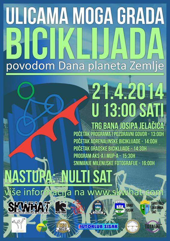 KIŠTRA TEAM Sisak i Klub SKWHAT u suradnji s Gradom Siskom te uz podršku Turističke zajednice SMŽ, PU sisačko-moslavačke, Autokluba Sisak, Gradske tržnice Sisak i ostalih partnera, organiziraju u ponedjeljak 21. travnja biciklijadu ”Ulicama moga grada” koja se održava u povodu obilježavanja Dana planeta Zemlje.