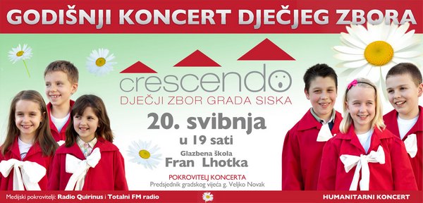 Pod pokroviteljstvom predsjednika Gradskog vijeća Veljka Novaka u petak, 20. svibnja s početkom u 19 sati svoj godišnji koncert u Glazbenoj školi “Fran Lhotka” održat će Dječji zbor Crescendo.