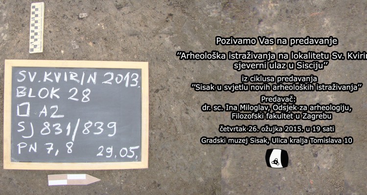 Predavanje u Muzeju 23 ožu 2015 13:03 U četvrtak, 26. ožujka u Gradskom muzeju Sisak održat će se posljednje predavanje u sklopu ciklusa „Sisak u svjetlu novih arheoloških istraživanja“. Predavanje pod nazivom „Arheološka istraživanja na lokalitetu Sv. Kvirin – sjeverni ulaz u Sisciju“ održat će dr. sc. …