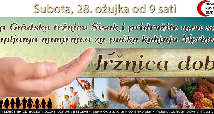 Tržnica dobrote za Merhamet 25 ožu 2015 14:03 Na Gradskoj tržnici Sisak u subotu, 28. ožujka s početkom u 9 sati održat će se još jedna Tržnica dobrote ovoga puta za pomoć pučkoj kuhinji Merhamet Sisak. Sudionici programa su Dobrotvorno društvo Merhamet – Crveni polumjesec Sisak, VIA Lipe, …