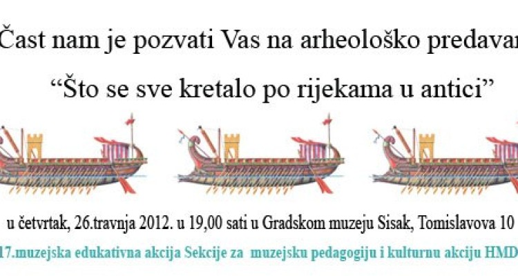 Predavanjem ”Što se sve kretalo po rijekama u antici” Gradski muzej Sisak započinje s ciklusom predavanja kojima je središnji motiv voda. Predavanja će se održati u sklopu 17. muzejsko-edukativne akcije pod nazivom „Voda“ koja će trajati do Međunarodnog dana muzeja, …