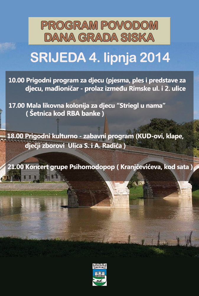 -Ove godine smo se potrudili da tijekom cijelog dana osiguramo sadržaje za sve uzraste. Tako već u 10 sati ujutro u blizini dječjeg igrališta u prolazu između Rimske ulice i Ul. Stjepana i Antuna Radića bit će organiziran dvosatni program za najmlađe s predstavom, nastupom Tiočeka i mađioničara. U 13 sati je svečana sjednica u Domu kulture gdje očekujemo dolazak predsjednika Vlade Zorana Milanovića i ministra Gordana Marasa. u 17 sati na Šetnici će tete i djeca DV Sisak Novi održati Malu likovnu koloniju „Striegl u nama“ u sklopu koje će djeca crtati motive grada Siska. U 18 sati u Ulici Stjepana i Antuna Radića će biti postavljena pozornica na kojoj će biti održan koncert pod nazivom Gradu za rođendan u sklopu kojeg će nastupiti klape, KUDovi i dječji zborovi, a sve sudionike Grad Sisak nagradit će nastupom mađioničara Luke Vidovića. Taj program završava u 21 sat kada se selimo na pozornicu kod sata gdje će biti održan koncert grupe Psihomodo pop kojeg poklanjamo građanima grada Siska. U Kranjčevićevoj ulici bit će postavljena izložba fotografija na otvorenom članova Foto kluba Siscia Obscura – najavila je gradonačelnica.