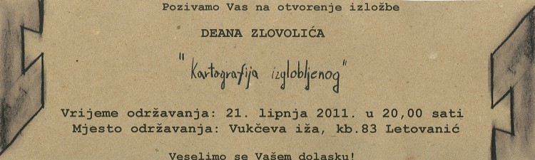 Etnografska zbirka Škofač poziva na otvorenje izložbe Deana Zlovolića pod nazivom „KARTOGRAFIJA IZGLOBLJENOG“. Izložba će biti otvorena 21.lipnja 2011. u 20 sati u VUKCEVOJ IŽI k.b. 83, Letovanić. Izložba će se moći pogledati do 20. srpnja 2011.