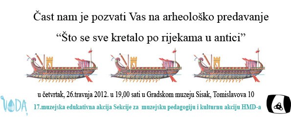 Predavanjem ”Što se sve kretalo po rijekama u antici” Gradski muzej Sisak započinje s ciklusom predavanja kojima je središnji motiv voda. Predavanja će se održati u sklopu 17. muzejsko-edukativne akcije pod nazivom „Voda“ koja će trajati do Međunarodnog dana muzeja, 18. svibnja.