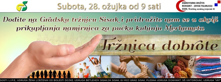 Na Gradskoj tržnici Sisak u subotu, 28. ožujka s početkom u 9 sati održat će se još jedna Tržnica dobrote ovoga puta za pomoć pučkoj kuhinji Merhamet Sisak. Sudionici programa su Dobrotvorno društvo Merhamet – Crveni polumjesec Sisak, VIA Lipe, Udruga žena liječenih od bolesti dojke – Sisak, Udruga Betlehem Sisak, Odbojkaški klub Sisak, GI „ Moj grad Sisak“, Mažoretkinje Plesne udruge Dijamant Sisak, Srednja škola Viktorovac te Županijska udruga povrćara SMŽ „Vrt“ . Tom prilikom prikupljat će se namirnice za Merhamet Sisak – pučku kuhinju, a kako doznajemo najpotrebnije su namirnice ulja, brašna,šećera, riže, soli, tjestenine kao i higijenske potrepštine.