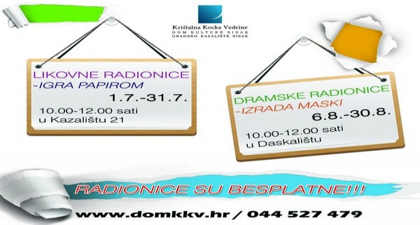 Likovne radionice, koje podrazumijevaju igru papirom, namijenjene su djeci od 6 do 10 godina. Papir je, naime, u rukama djece papir čudesno sredstvo igre i zadovoljstva. Možemo ga oblikovati na mnogo načina. Stoga će upravo uz razne vrste papira polaznici radionica među ostalim naučiti kako izraditi reljefe, cvijeće i životinje. Likovna će se radionica pod vodstvom Tanje Tole Majstorović odvijati u Kazalištu 21, radnim danima tijekom mjeseca srpnja (1.7. – 31.7.), od 10 do 12 sati.