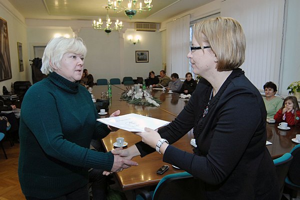 Gradonačelnica Kristina Ikić Baniček uručila je danas u Gradskoj vijećnici dvadeset ugovora na određeno vrijeme dugotrajno nezaposlenim osobama s područja grada Siska koji će u naredna tri mjeseca obavljati poslove u sklopu Programa javnih radova „Pomoć starijim i nemoćnim osobama na području grada Siska“.