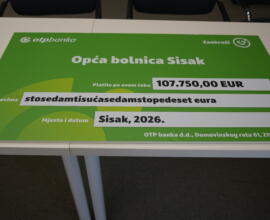 OTP banka d.d., u suradnji s Mastercardom, nastavlja svoj humanitarni program „Zaokruži“ kroz donaciju Općoj bolnici Dr. Ivo Pedišić Sisak u iznosu od 107.750 eura. Od ovog iznosa bolnica će nabaviti operacijski stol vrijedan 157.000 eura, a preostali iznos osigurali su dodatne donacije Ministarstva zdravstva i Grada Siska, čime je omogućena kupnja stola i poboljšanje uvjeta za sigurnije i učinkovitije operativne zahvate.
